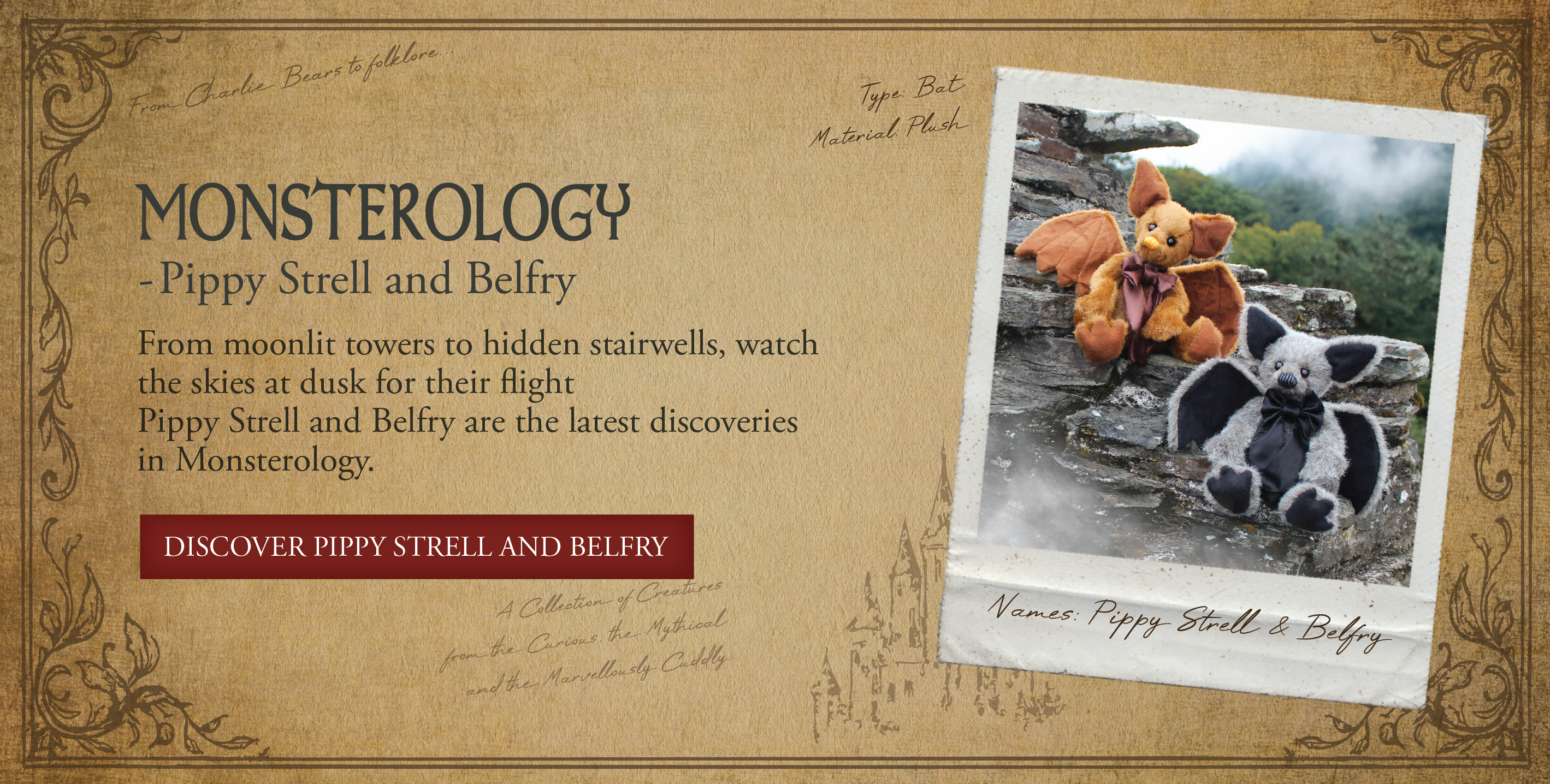 Pippy Strell is an irresistibly cuddly bat, lovingly crafted from soft, short-pile brown plush. With his oversized ears and large, expressive wings, Pippy captures the quirky charm of these nocturnal creatures. He features a delicately hand-embroidered orange nose, charming bat-shaped feet, and a silky chocolate brown bow tied neatly at his neck. Designed with care and character, Pippy Strell is perfect for imaginative play, snuggly companionship or as a unique display piece. Suitable for ages 3 years+. Bat height: 23cm/9”/7.7 Bear Paws