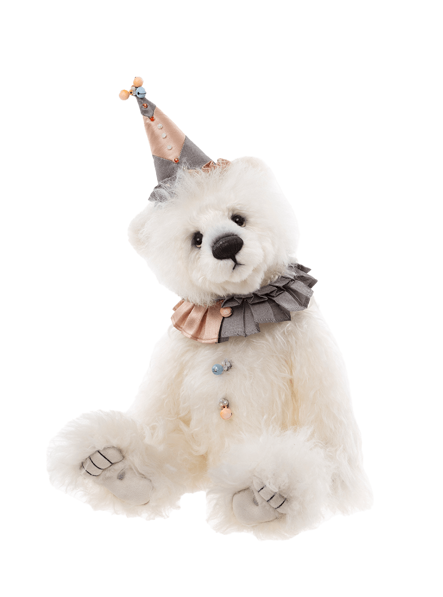 Say hello to Colvig, a charming white bear inspired by a beloved American entertainer. Part of the Charlie Bears Isabelle Collection, this exquisite bear is meticulously handcrafted from a luxurious mix of mohair and alpaca. Colvig is no ordinary bear, he’s a delightful clown adorned with a unique hat, playful collar, and jingling bell. While Colvig shines solo, he pairs bear-utifully with his companion, Skelton, creating a duo that captures the magic and nostalgia of classic entertainment. Limited edition of just 200 pieces worldwide. Clown bear height: 41cm/16”/13.7 Bear Paws.